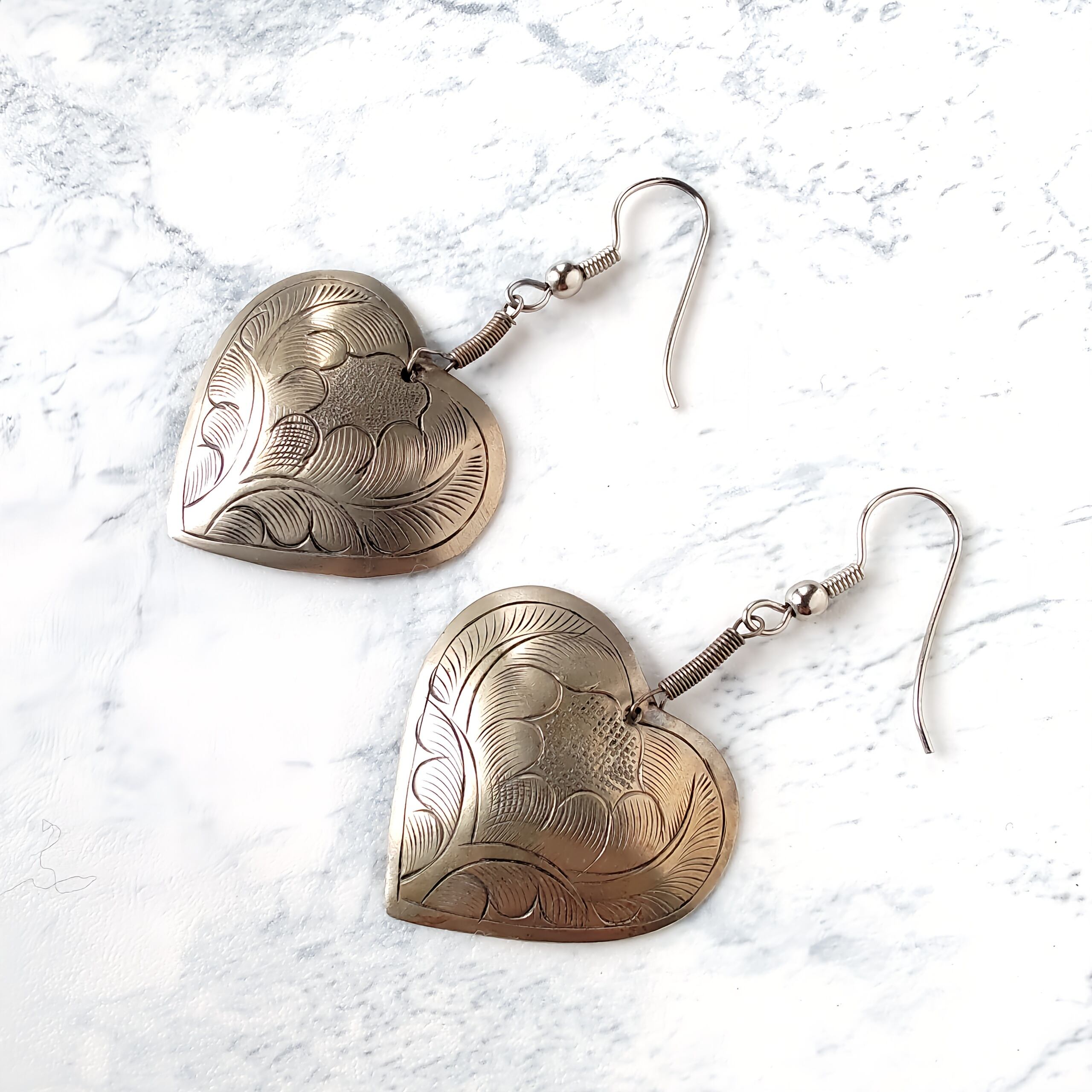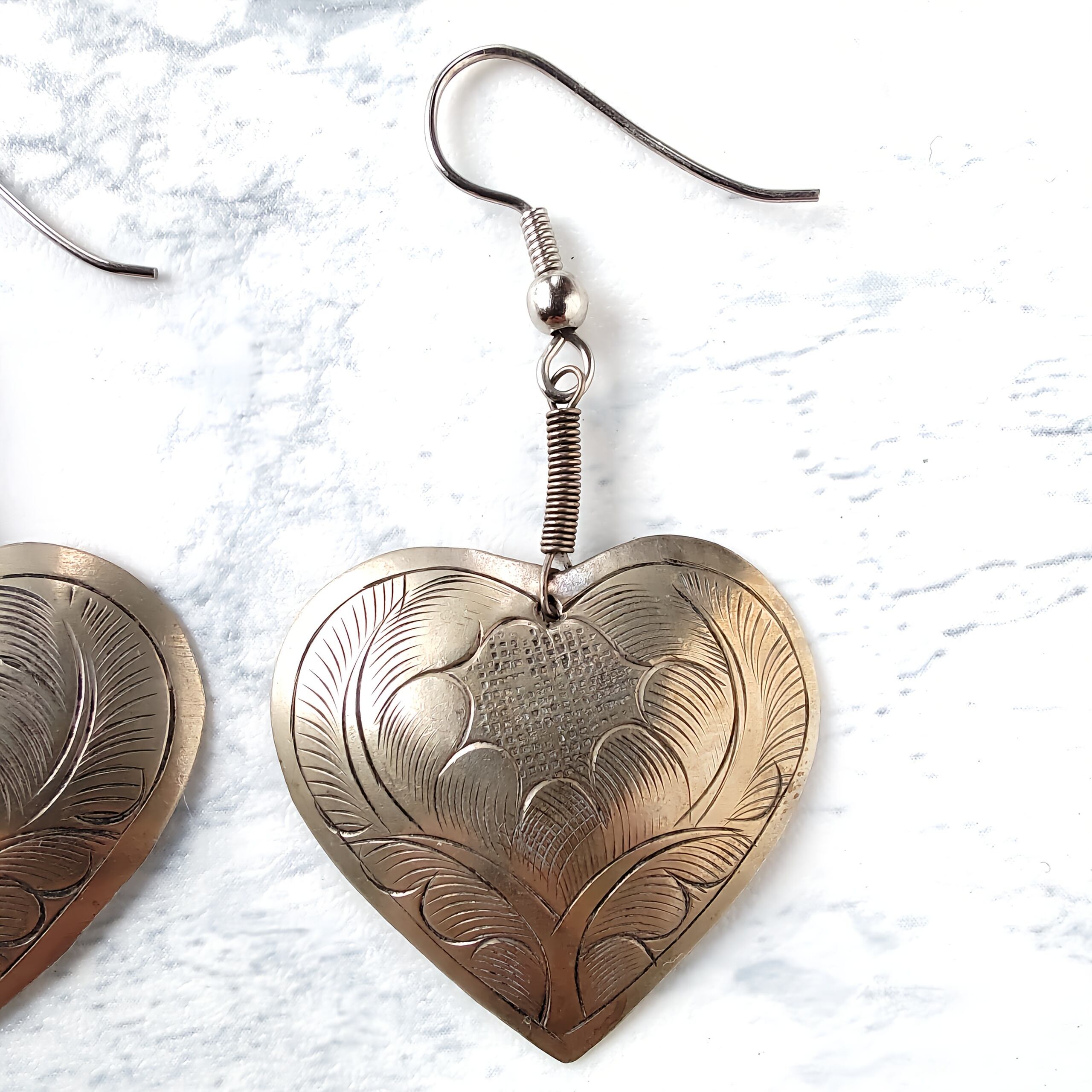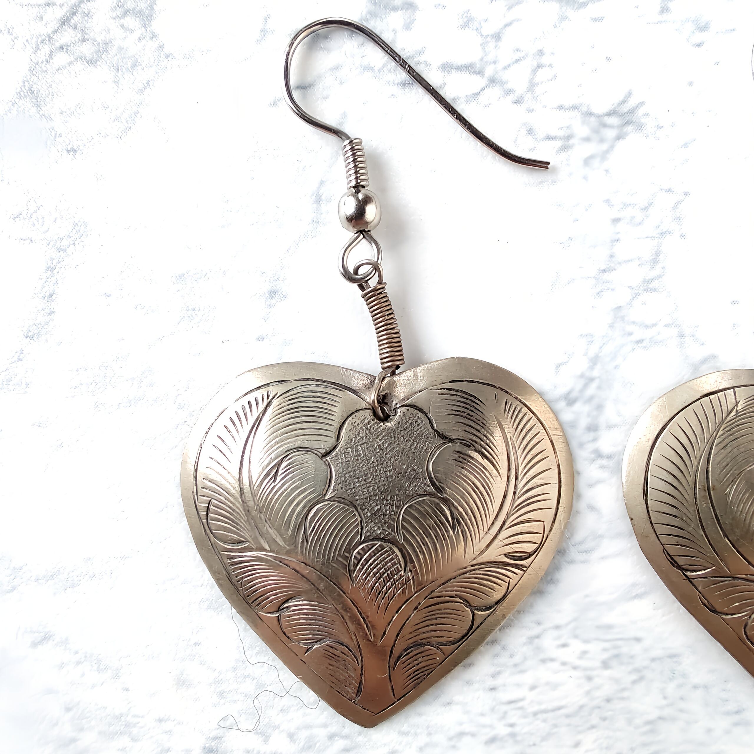 羽根の模様が彫られたハート型のくすんだシルバーメタルのプレートが揺れるデザインのヴィンテージピアスです。