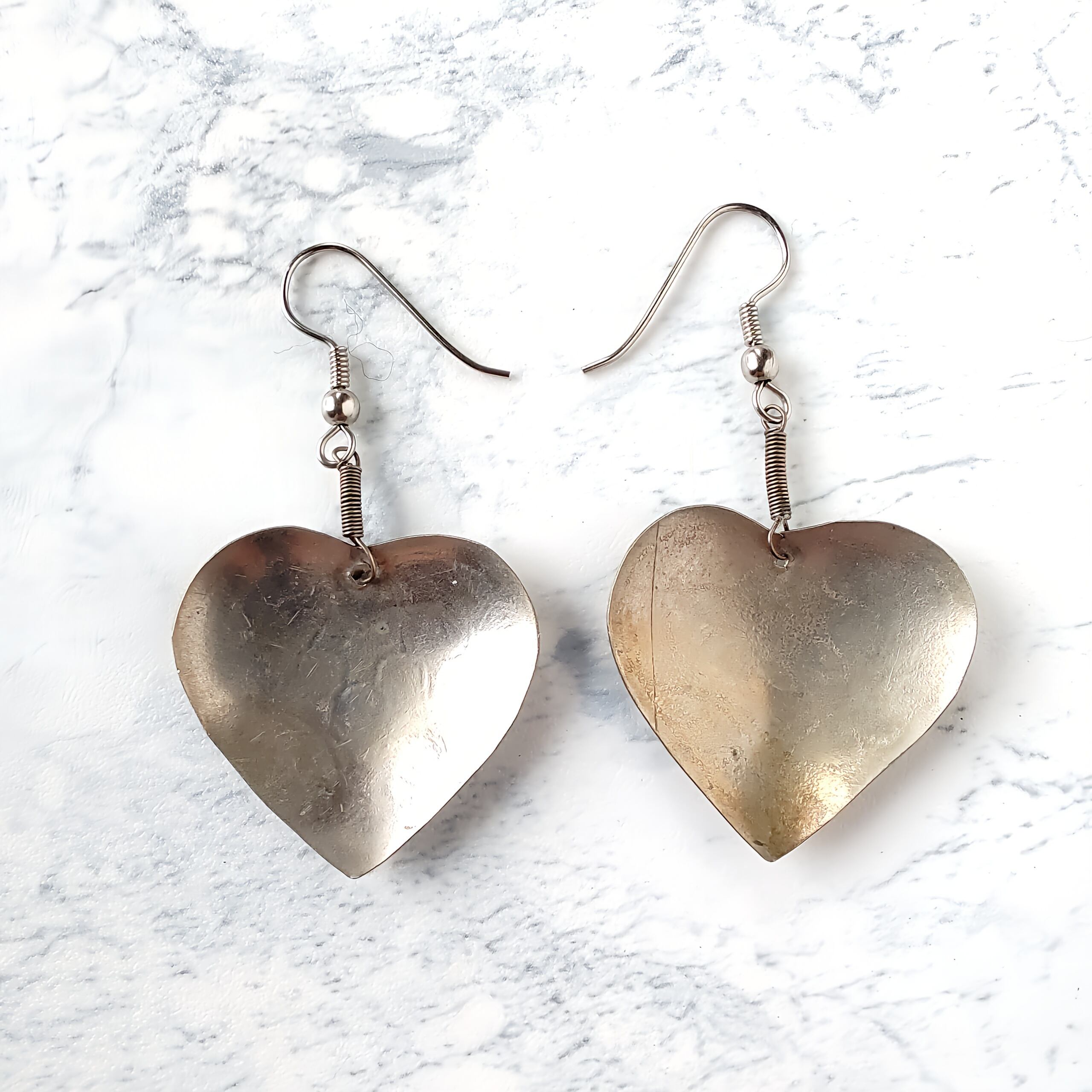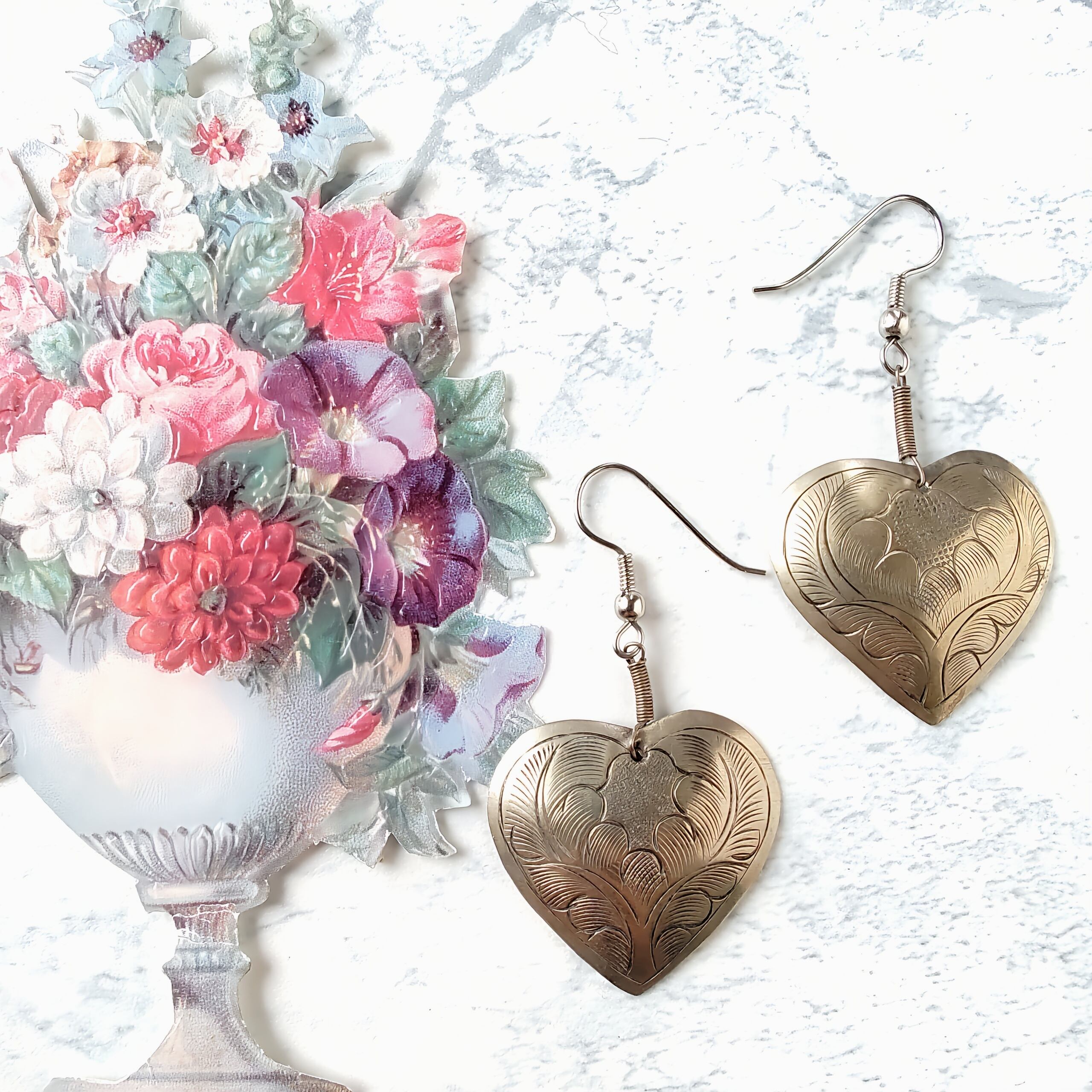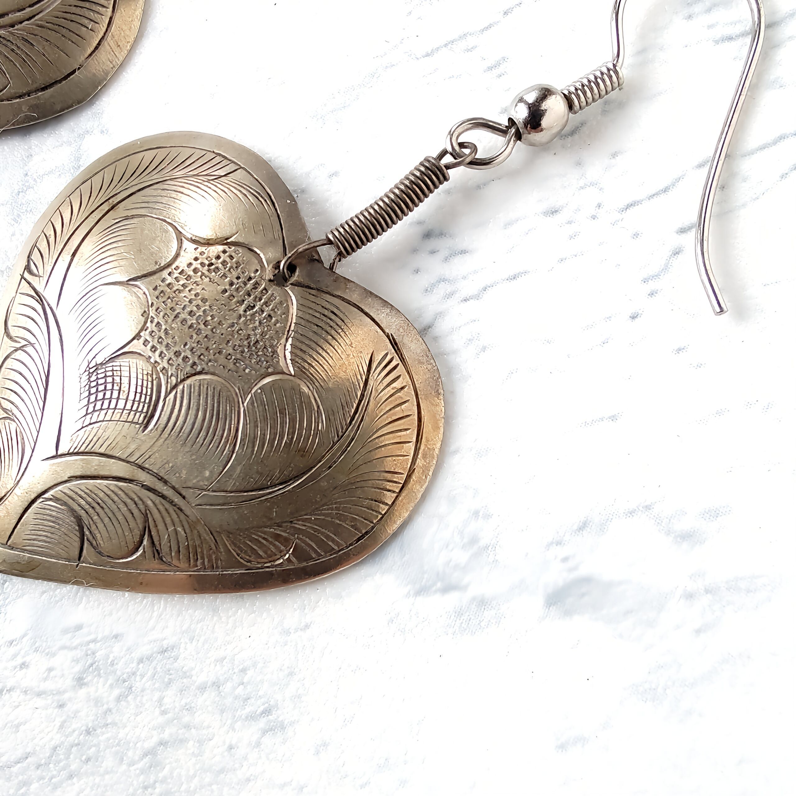 羽根の模様が彫られたハート型のくすんだシルバーメタルのプレートが揺れるデザインのヴィンテージピアスです。