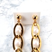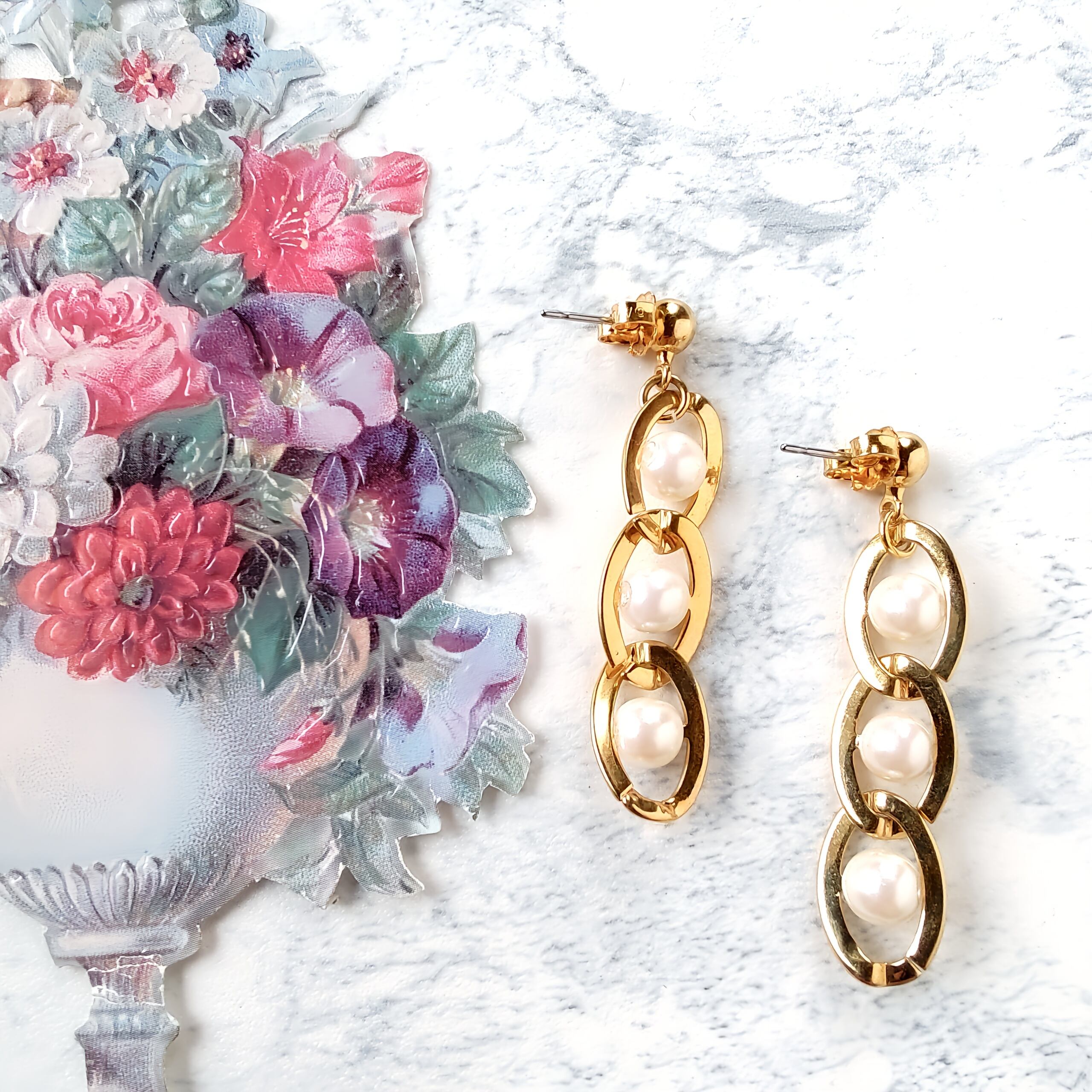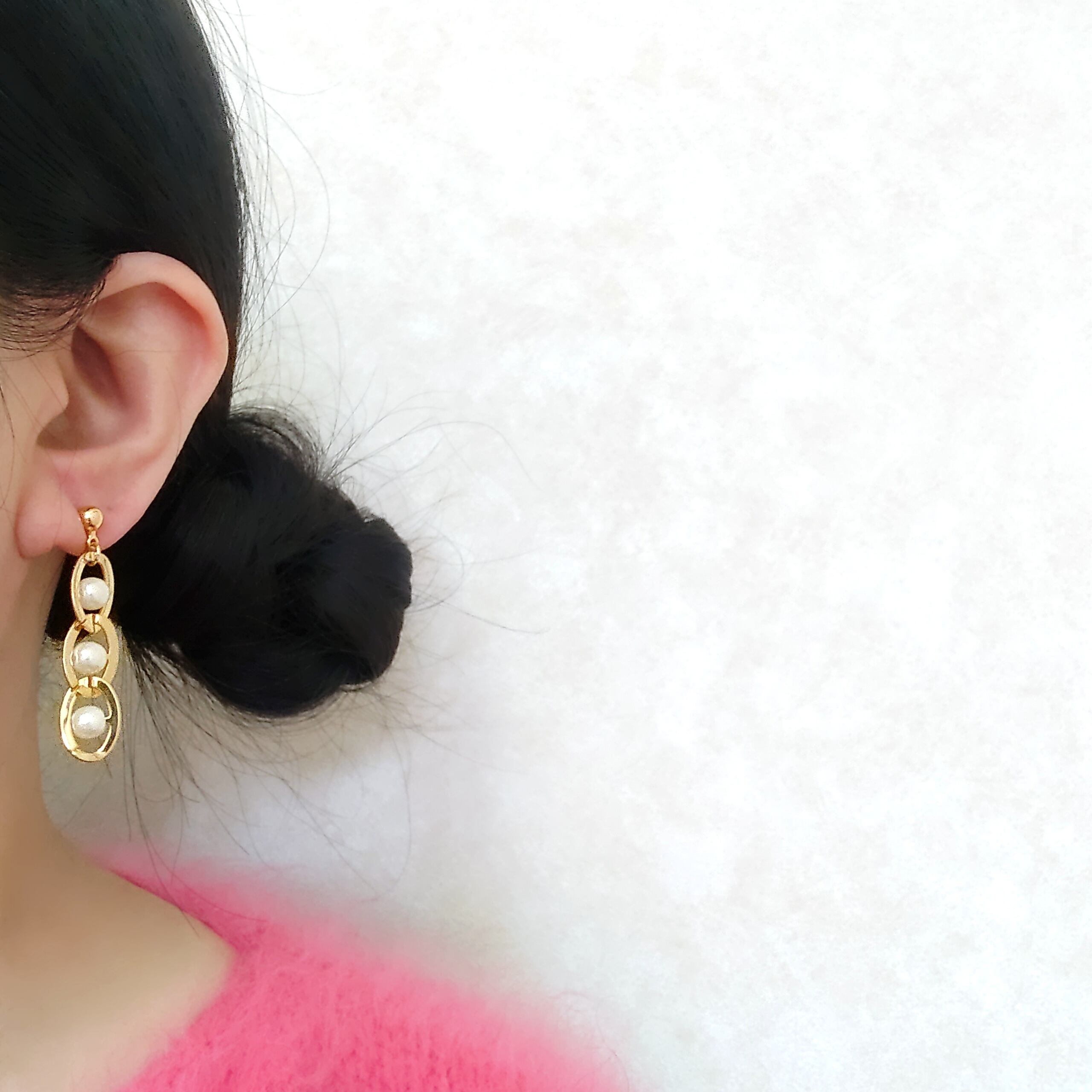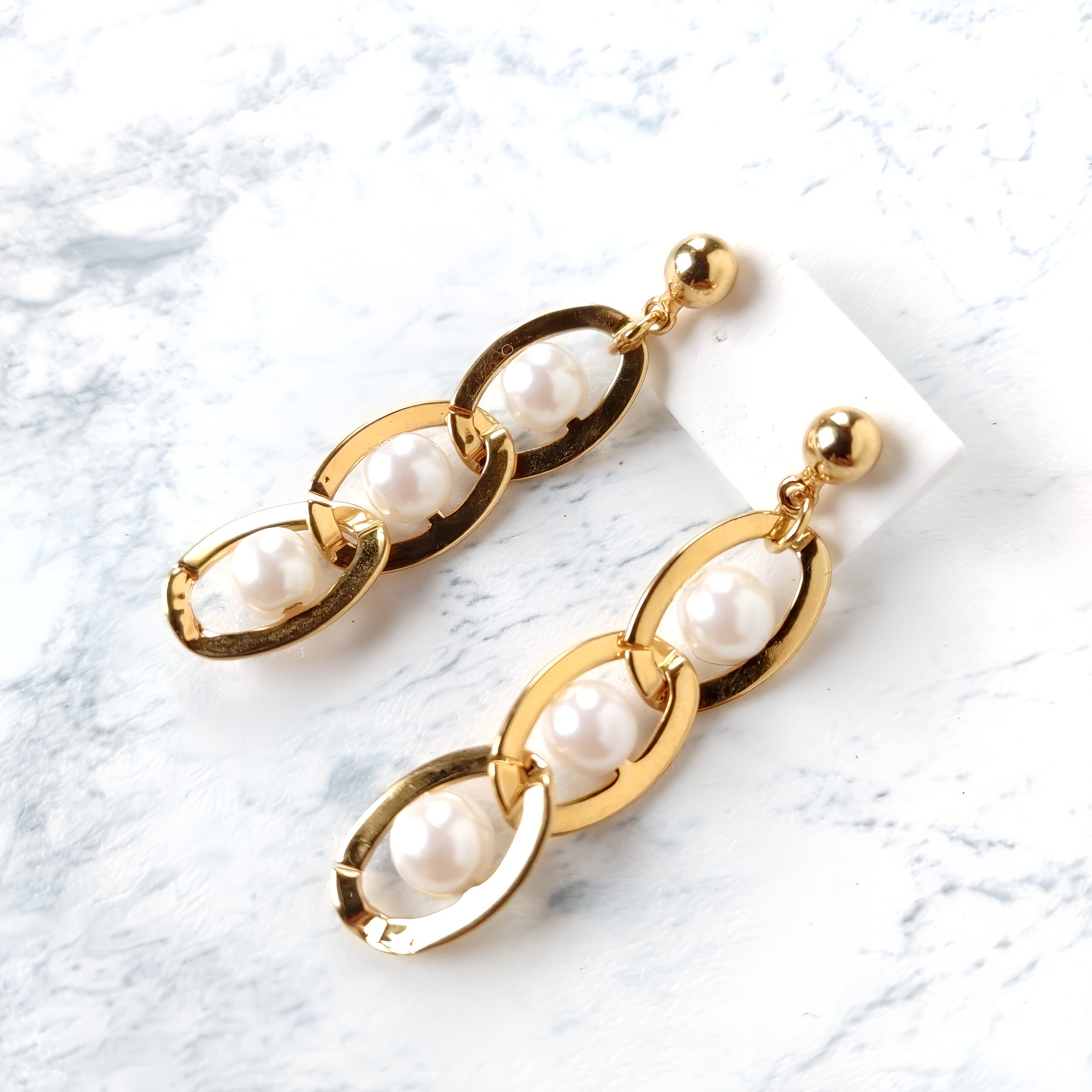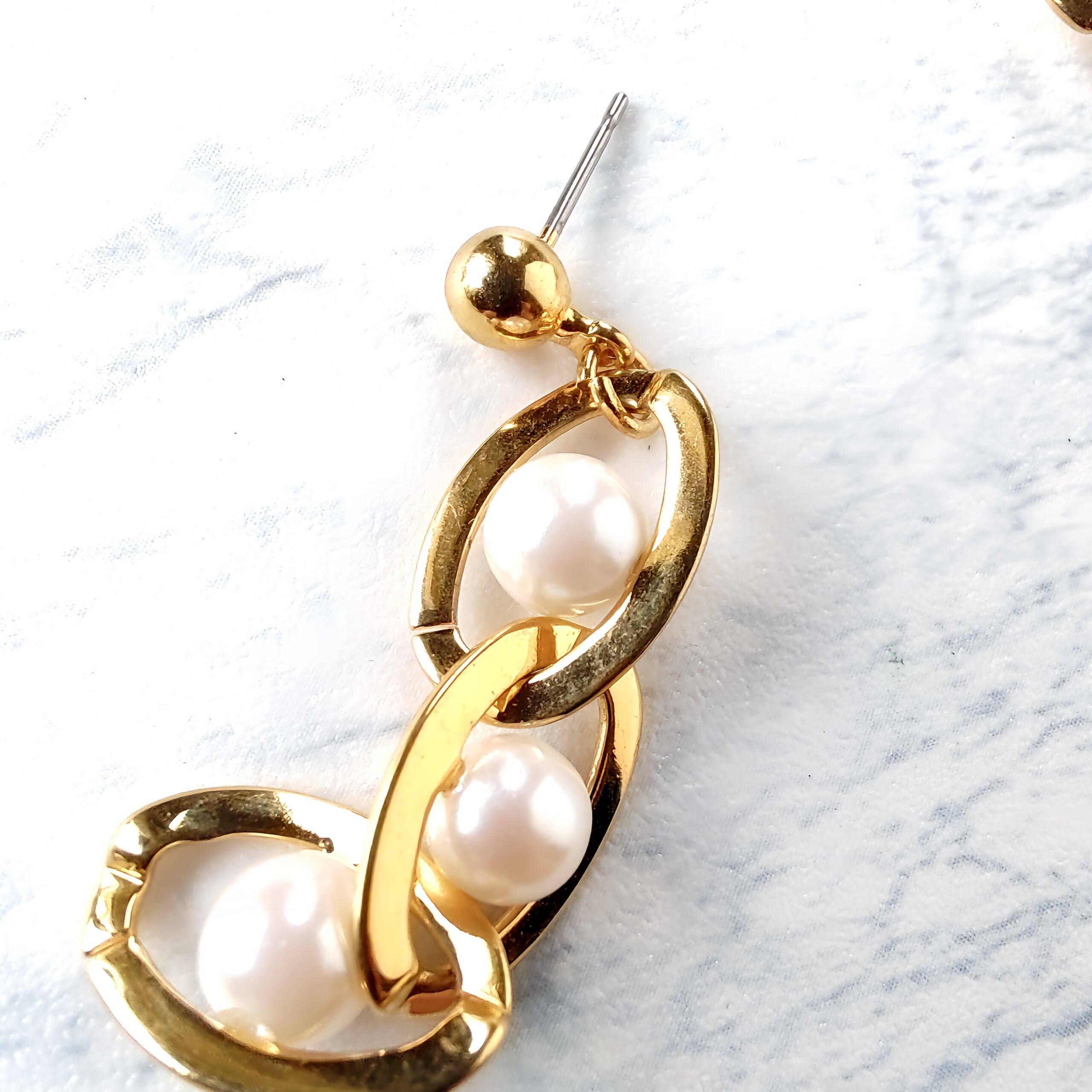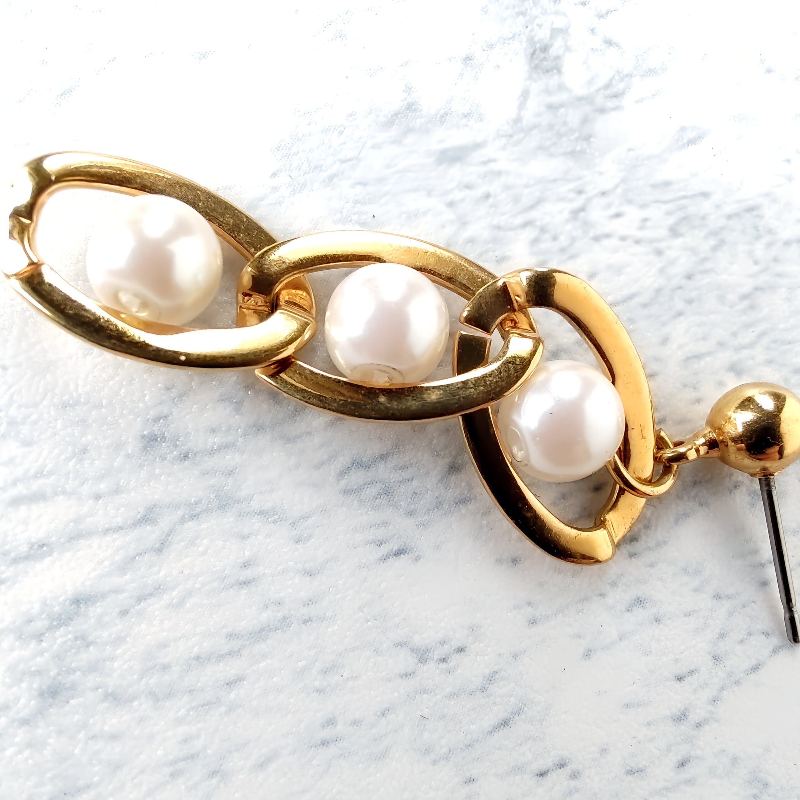 Drop”のフェイクパールが通されたゴールドメタルの輪が3つ連なったデザインのヴィンテージピアスです。